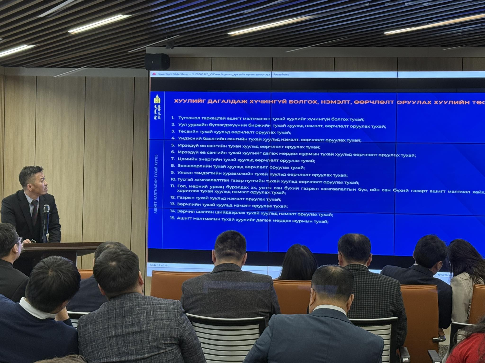 Цаашид хууль эрх зүйн орчныг сайжруулах хүрээнд Ашигт малтмалын тухай хууль, Хүнд үйлдвэрийн тухай хууль, Газрын тосны тухай хууль, Газрын тосны бүтээгдэхүүний тухай хуулиудад нэмэлт, өөрчлөлт оруулах болон шинэчилсэн найруулгын төслүүдийг УИХ-ын хаврын чуулганаар хэлэлцэхээр төлөвлөж байгааг мэдэгдлээ.